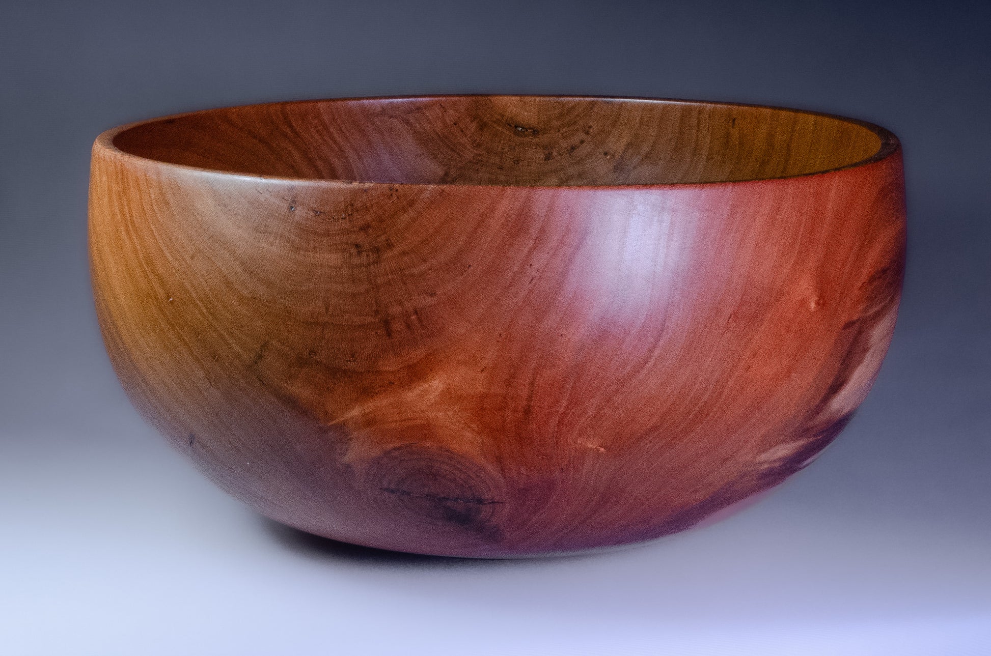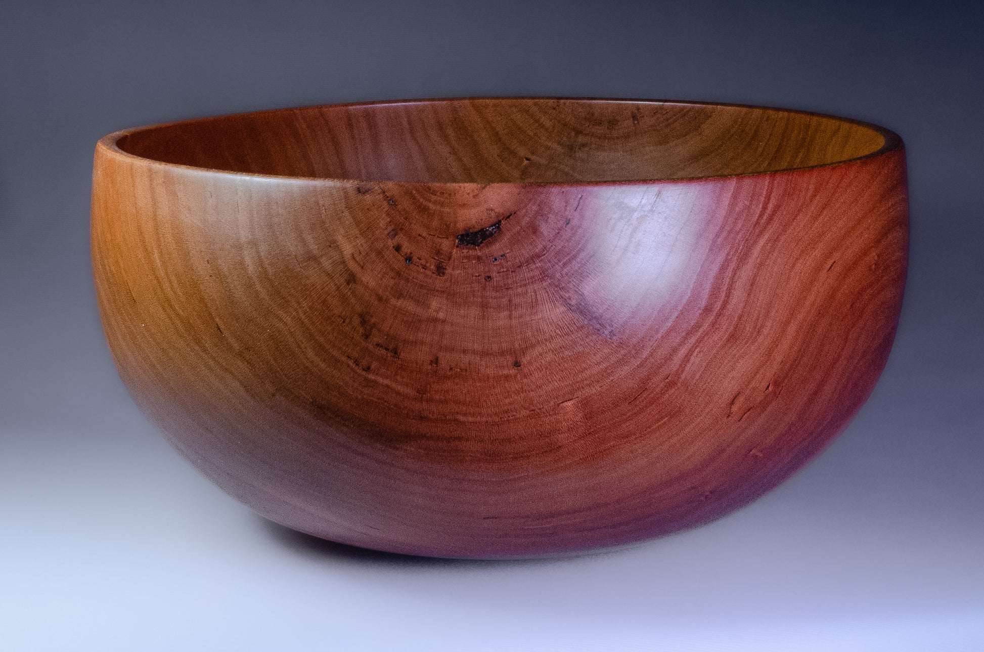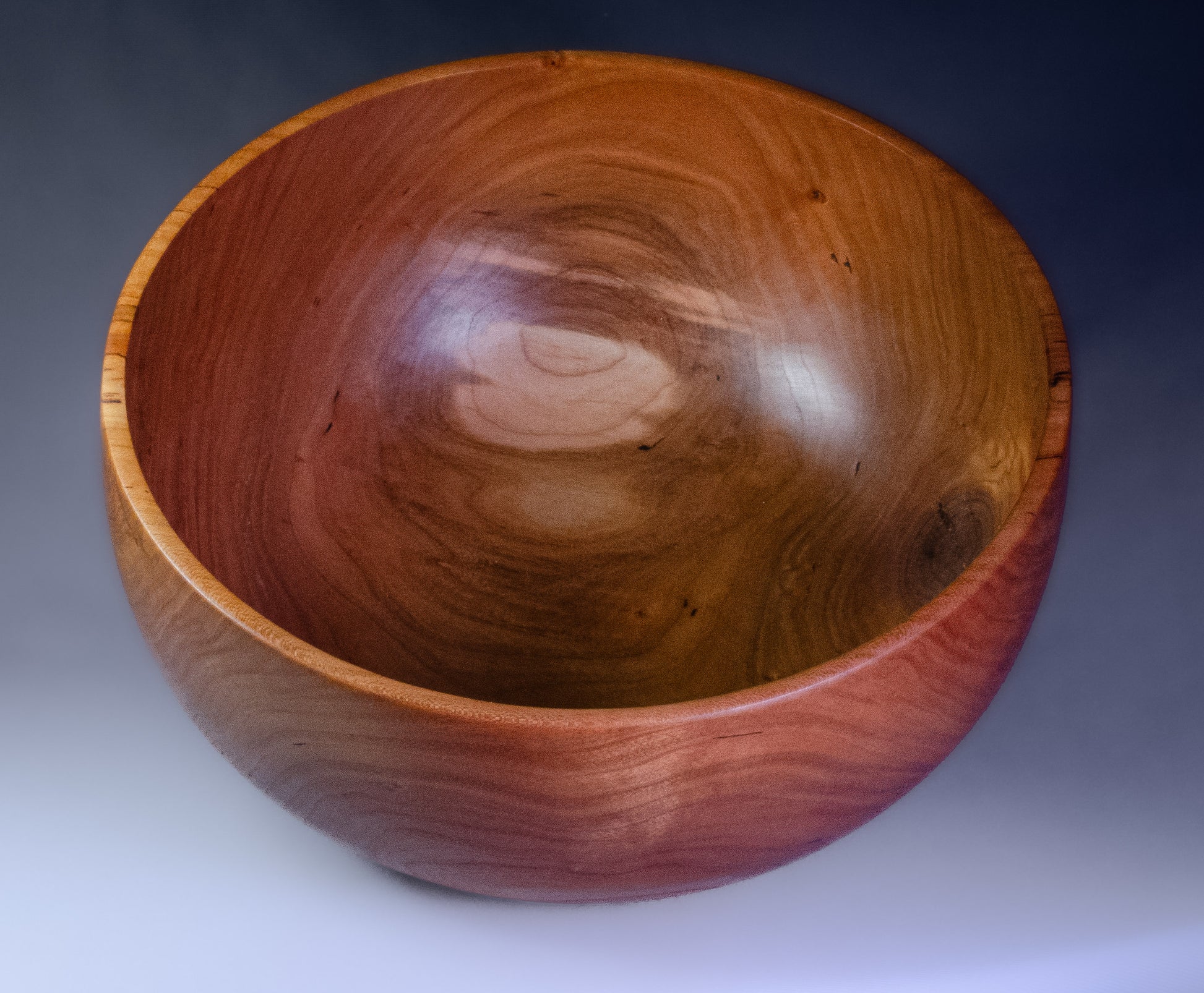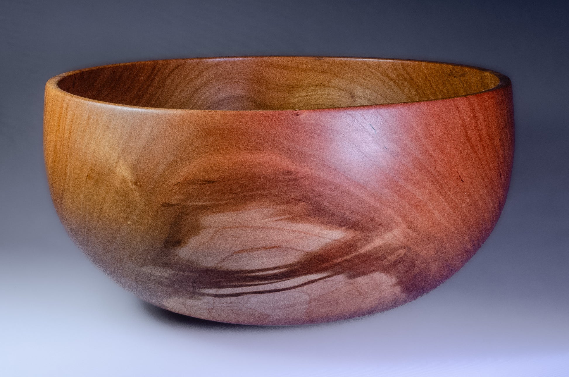 This black cherry bowl shows off the richness of cherry grain and tonal range. The warm reddish-browns are accented by a couple of splashes of lighter sapwood and a darker knot. At 8.5" x 4.5" this bowl is well suited for salads, fruit, popcorn, and other foods -- the finish is food safe.