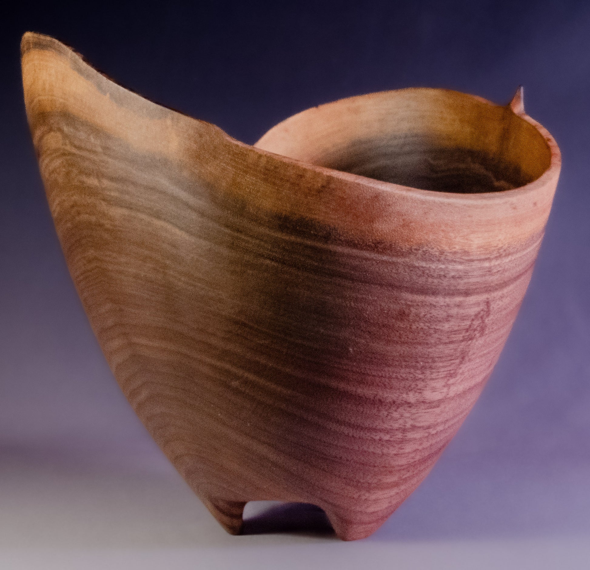 The form of this black walnut bowl complements the wavy nature of the natural edge and follows down to the carved feet. It is 8" tall and 8" diameter and is signed on the bottom by the artist. As a centerpiece, display item, or used as a serving bowl -- yes, it is finished with food safe oils and wax -- the warmth of the walnut and the tactility of the curves make it an inviting addition in many settings.