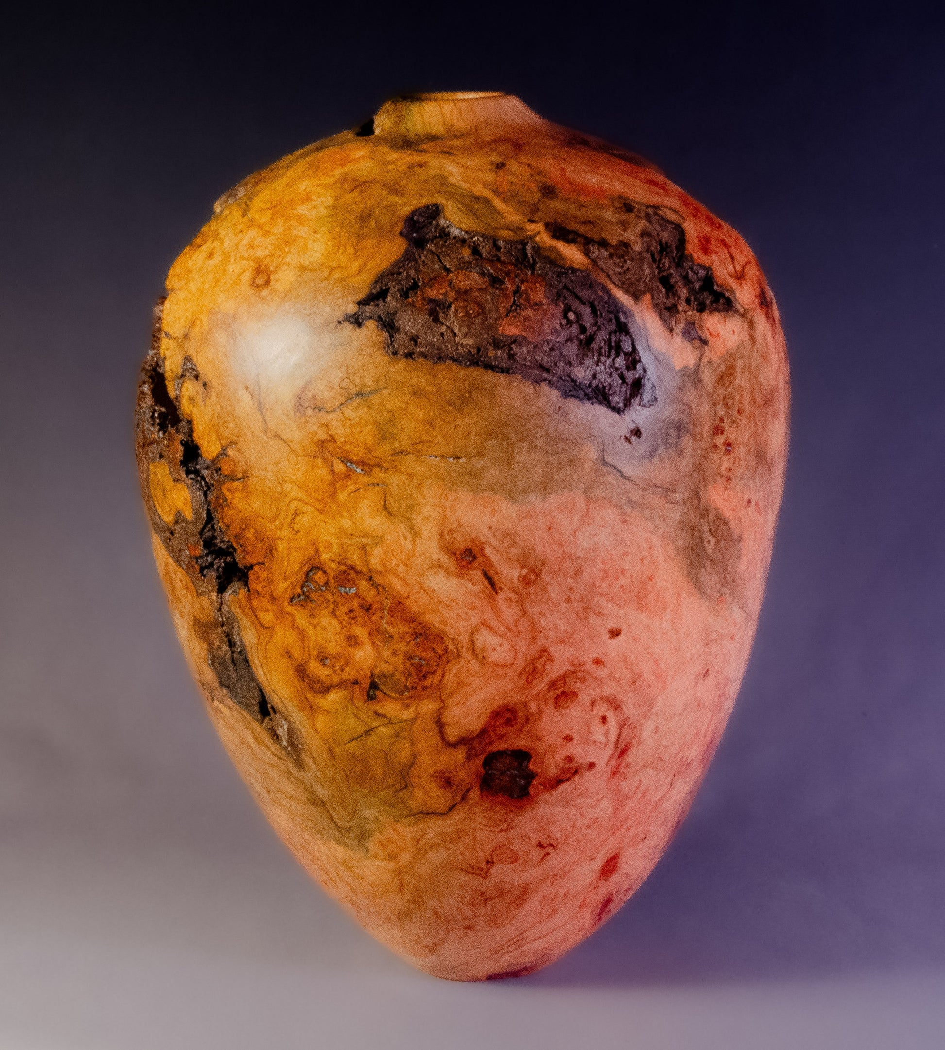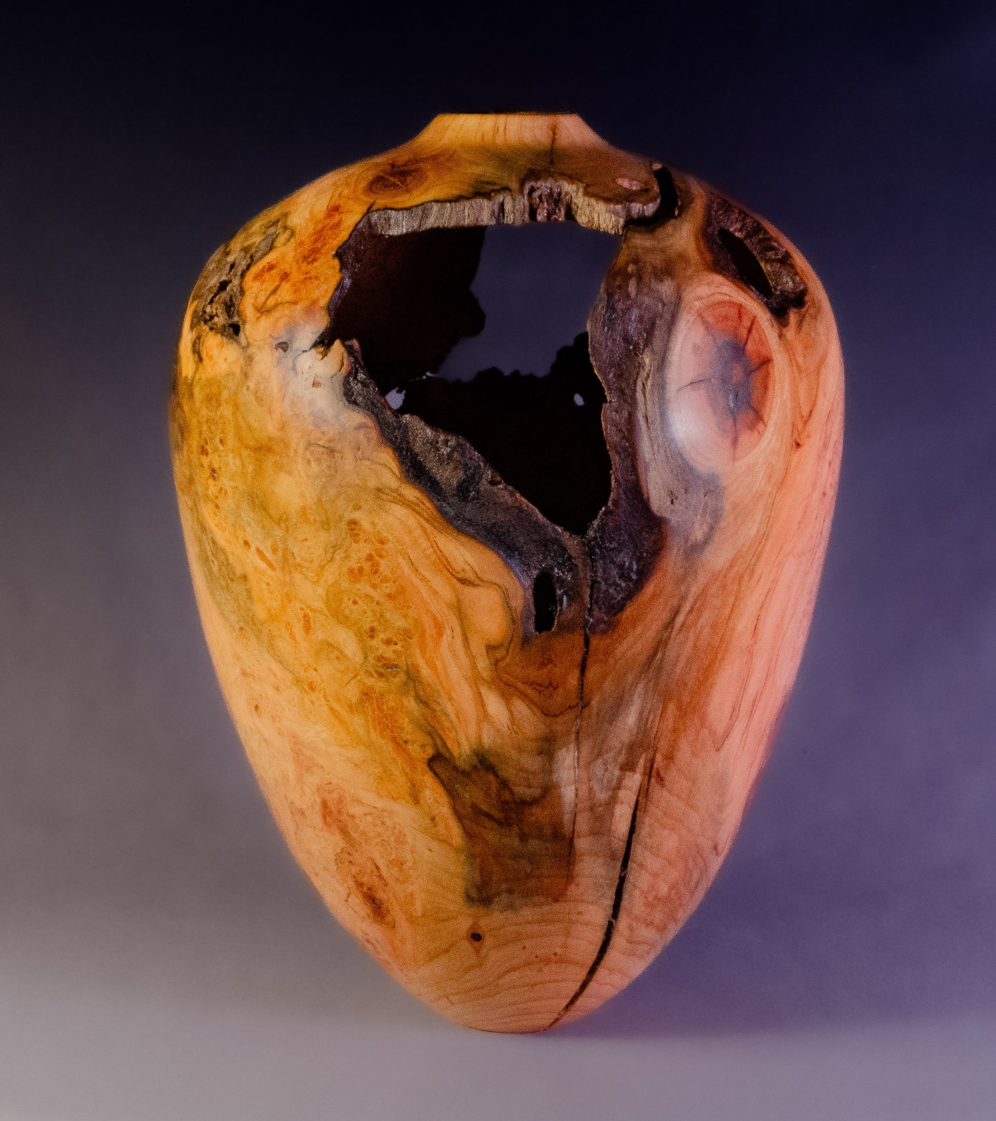 Hollow form made from a cherry burl, displaying the wild grain patterns, bark inclusions, "windows," and irregularities that make burls so spectacular to work with. This piece is 8.5" tall and 6" diameter and is signed on the bottom by the artist.
