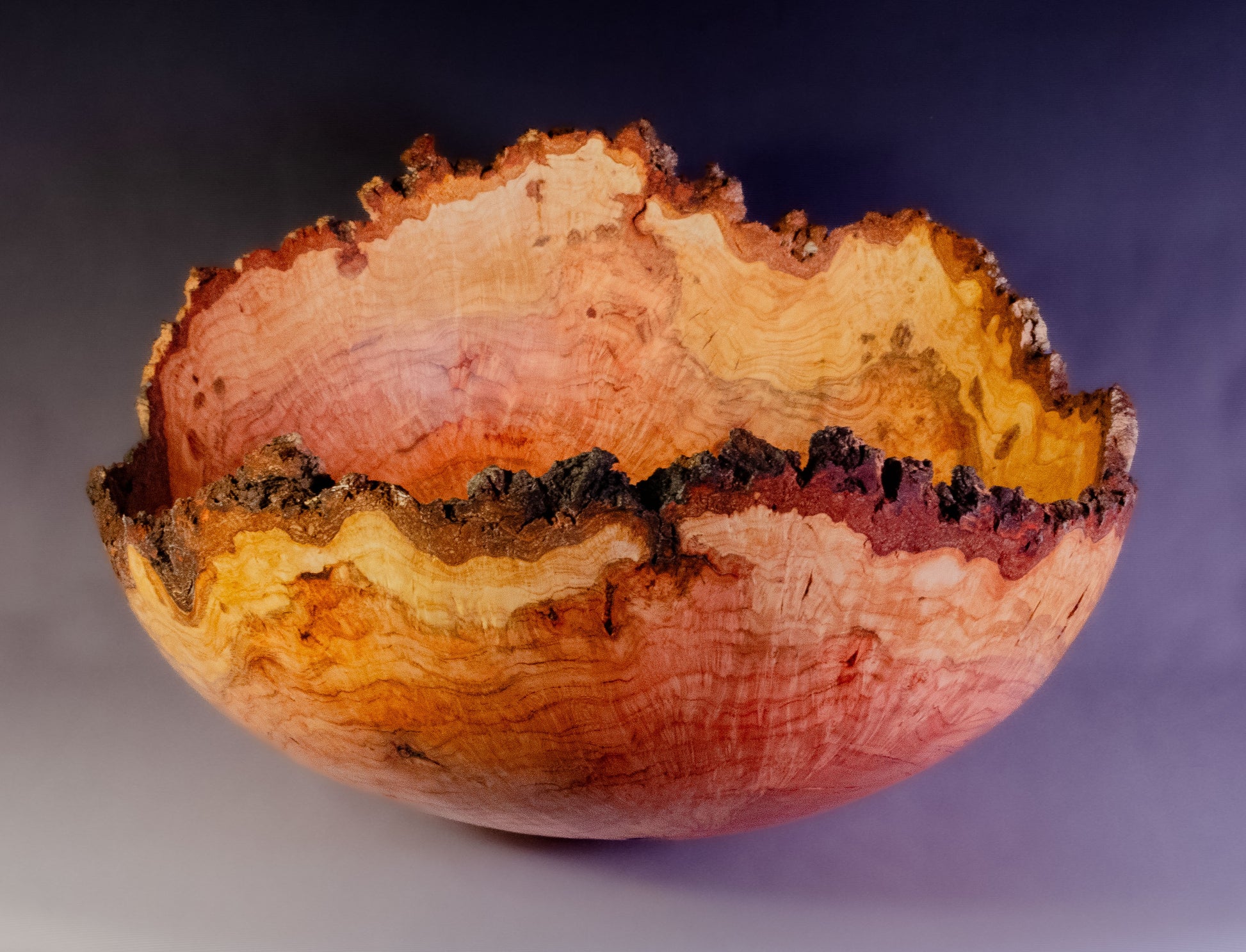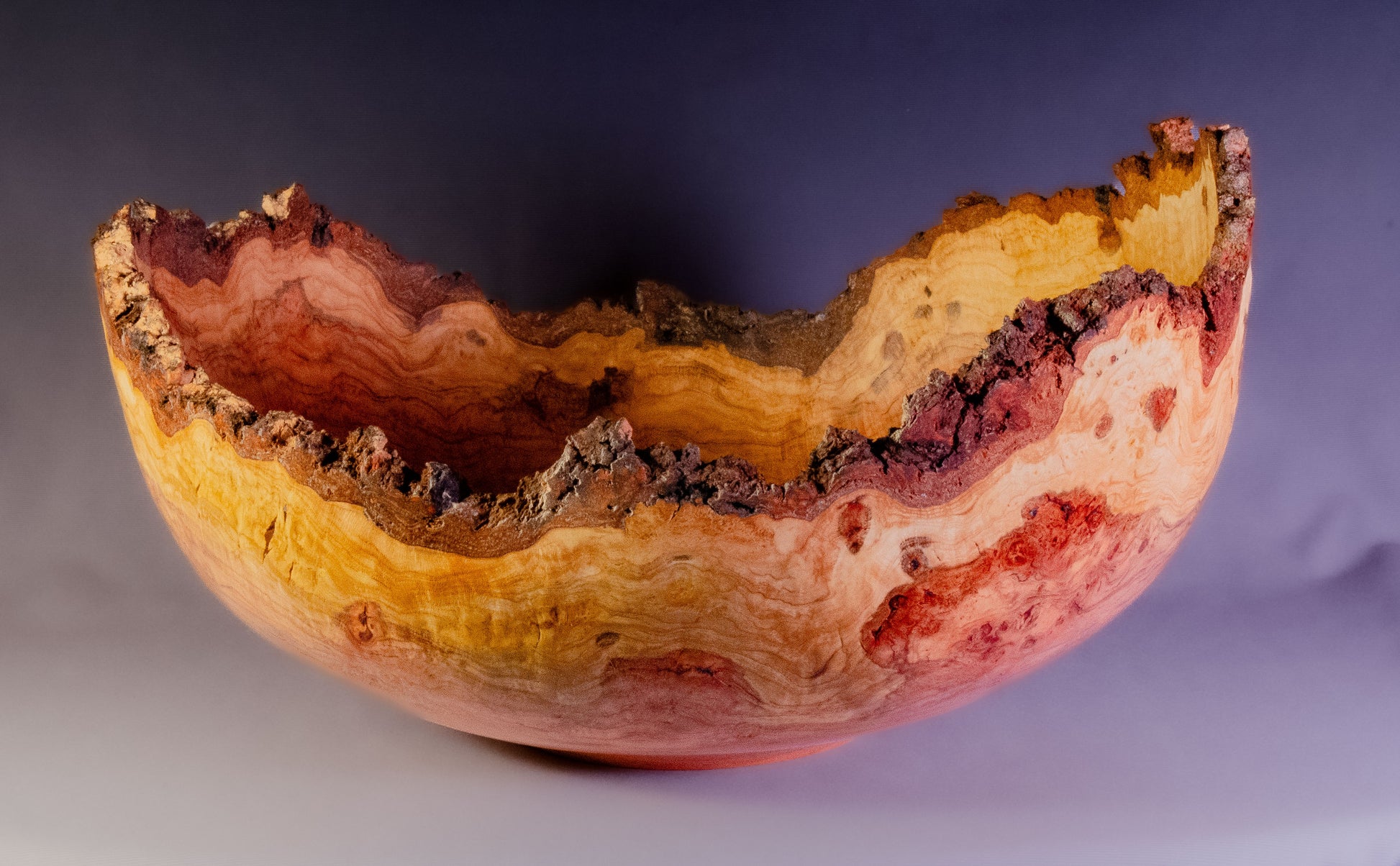 This bowl is made from a large cherry burl harvested from a downed tree near my home. The bowl is 12" in diameter and sits 6.25" off the table. The burl grain patterns are stunningly wild and together with the natural edge this piece will be prominent as a centerpiece or on a display shelf. It is finished with food-safe walnut oil and is signed by the artist on the bottom.