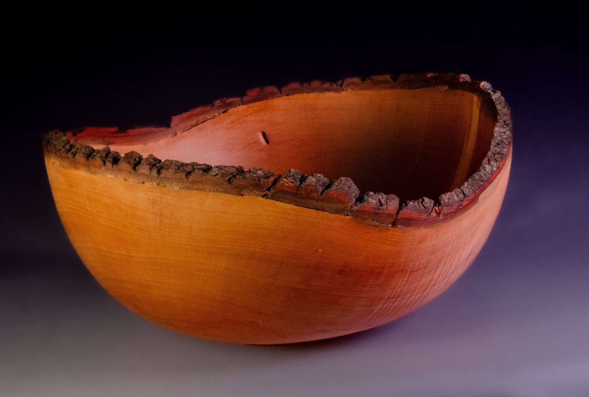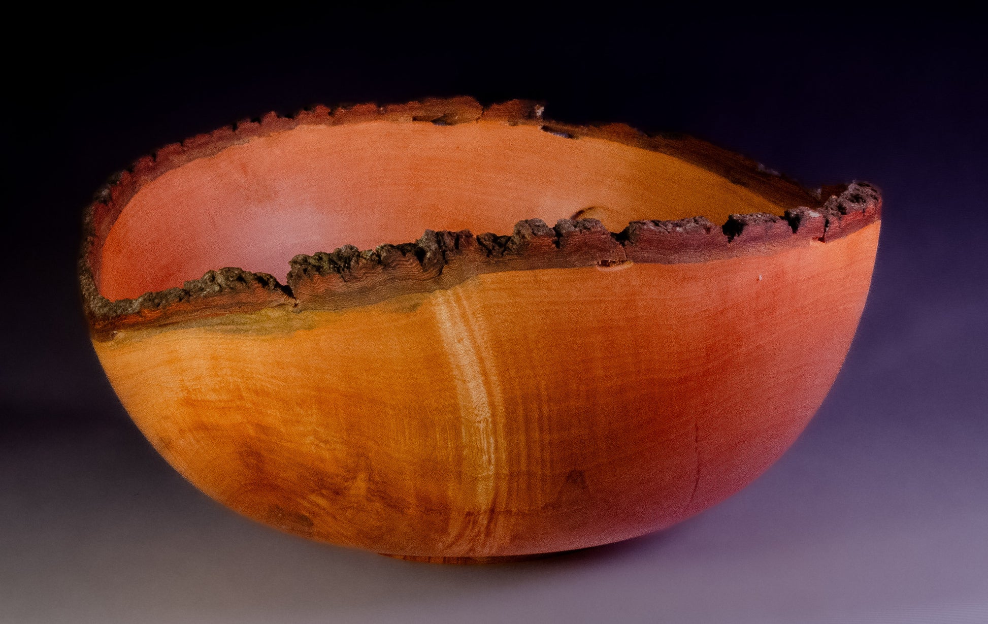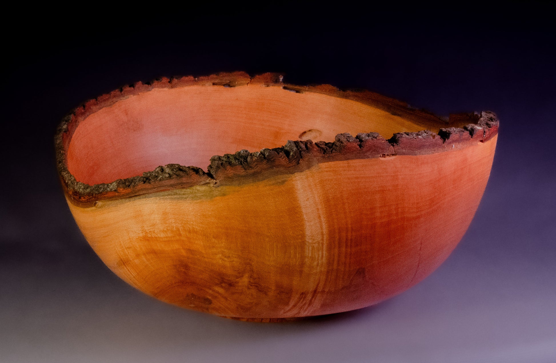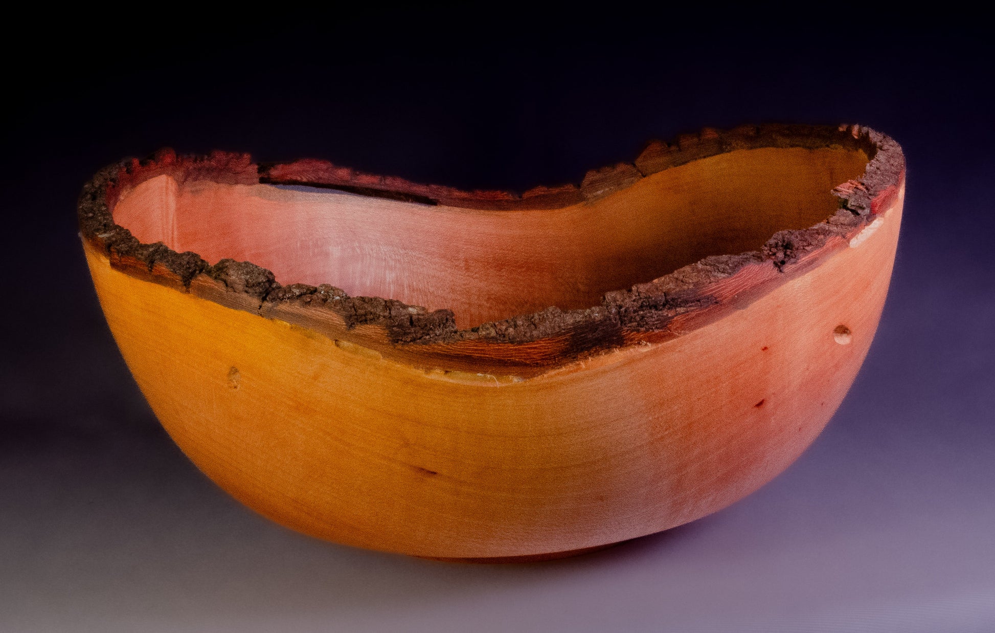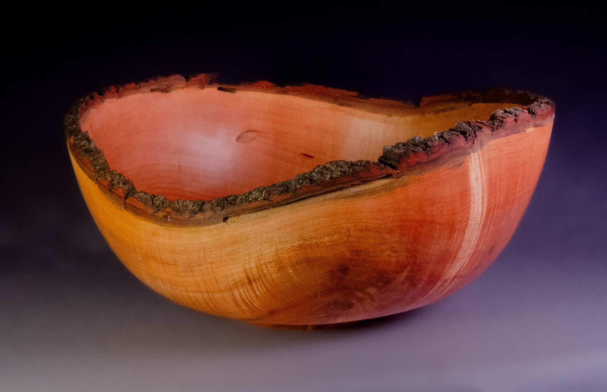 This maple bowl came from a crotch of a tree, resulting in a feathering pattern in the grain. The bowl has it's natural edge with the bark. The wood has a very warm reddish-brown tone. It is 4" x 9" and is finished with food safe oils and wax. It is signed on the bottom by the artist.