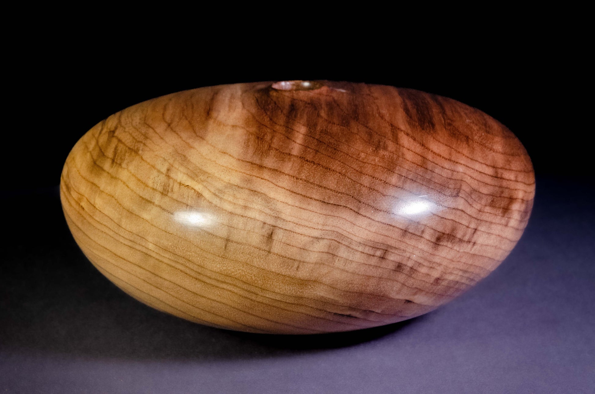This vessel shows off the curly structure and chatoyance of the grain in this piece of myrtle wood. The piece is 8" diameter by 4" tall.