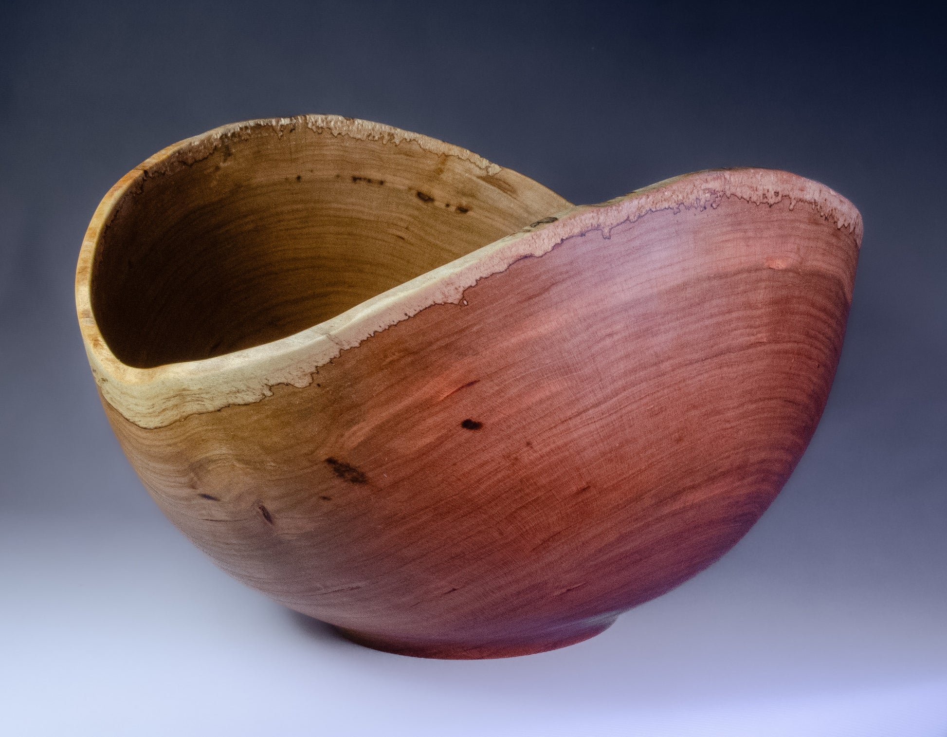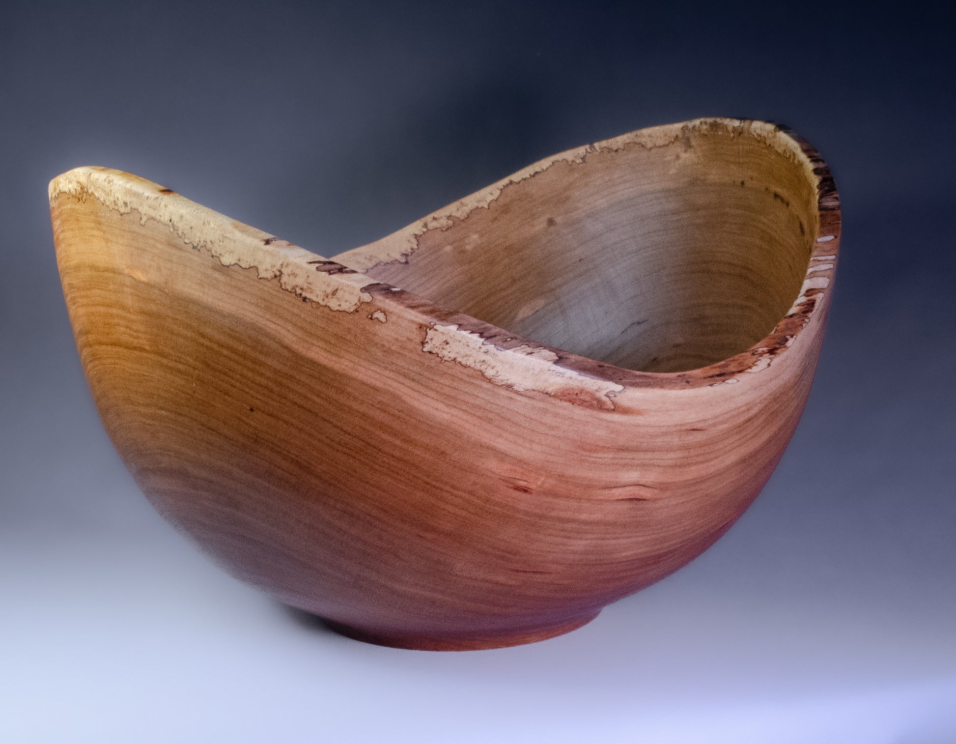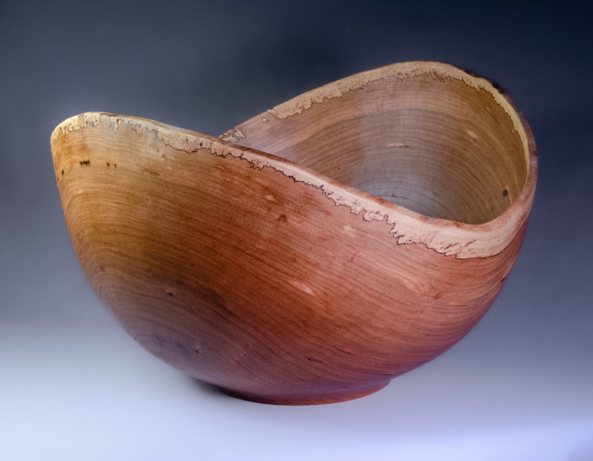 The natural edge of this bowl gives it a balanced, flowing feel. The thin layer of sapwood is spalted, giving it more visual interest and helping to frame the rich, warm cherry heartwood. The bowl is 9.75" x 5.75", finished with food-safe oils and wax, and is signed on the bottom by the artist.