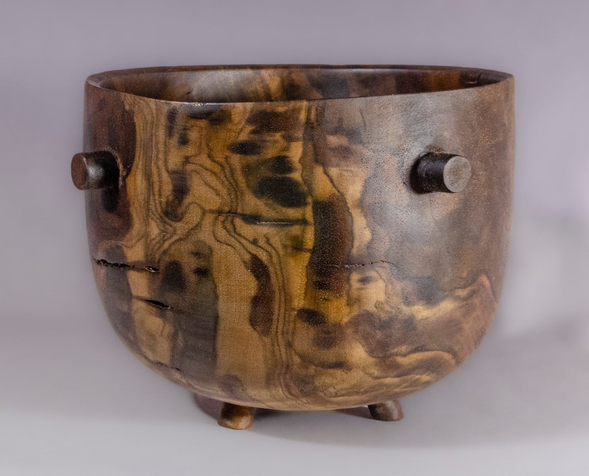 This bowl is made from claro walnut burl. It has 3 carved feet and decorative knobs along the edge that repeat the foot structure. It is finished with food safe oils and wax.